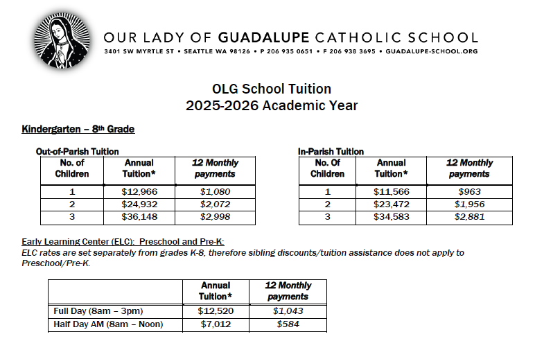 Grades K-8 have two tuition rates: a lower rate for families who are in-parish and contributing members of Our Lady of Guadalupe Parish, and a higher rate for families who are out of parish.